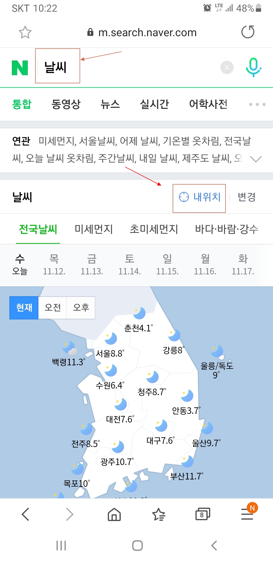 현위치 날씨 검색 방법/전국 날씨/날씨 어플