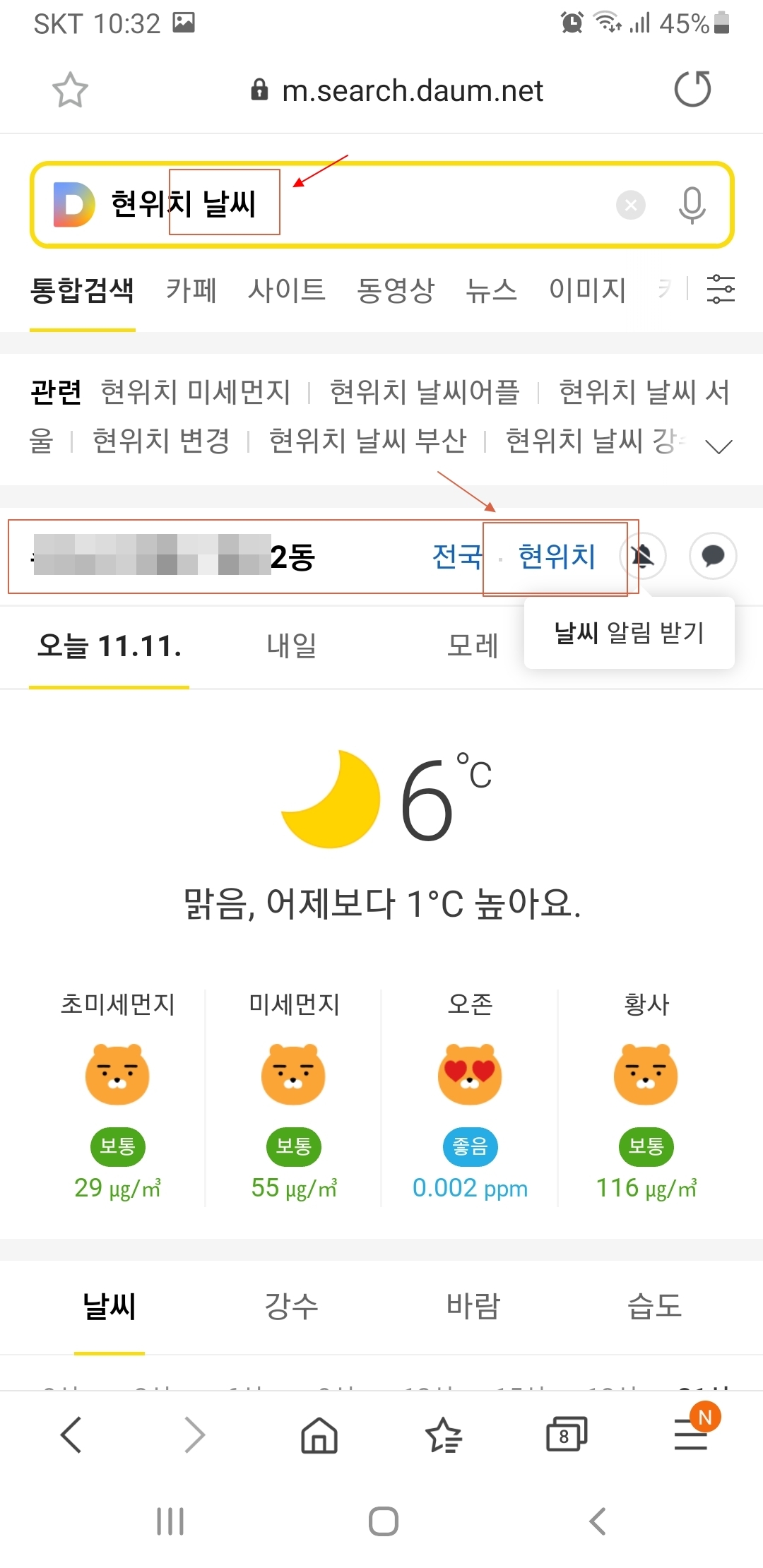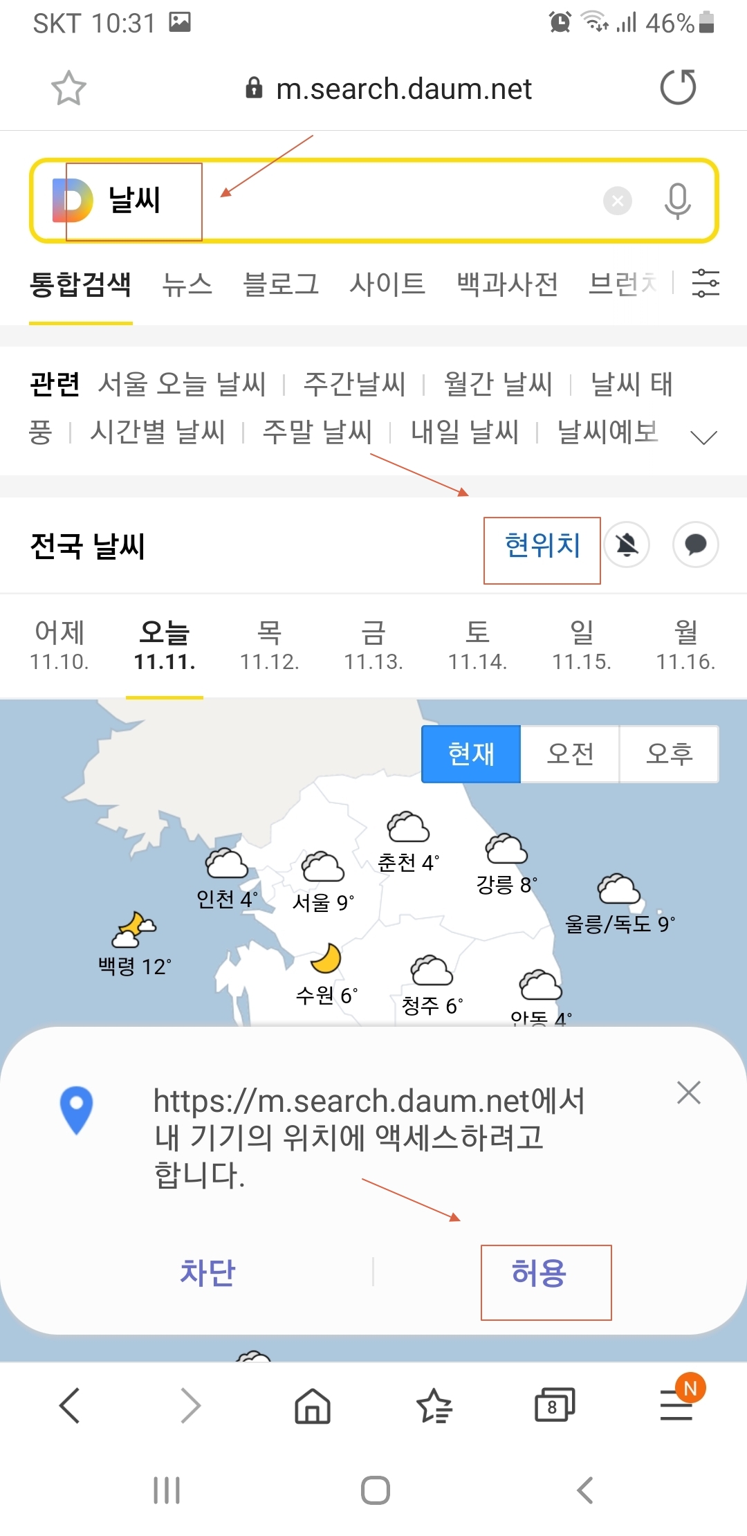 a. 다음 모바일 웹이나 어플에서도 이용방법은 동일합니다. 검색어를 입력한 뒤 현위치를 클릭하면 기기의 위치에 엑세스하려한다는 팝업창이 뜨는데 허용을 클릭해서 위치 기능을 켜야 현위치가 검색되어 동까지 표기됩니다. 두 포털에서 제공하는 기상정보는 유사한 것으로 보입니다.
