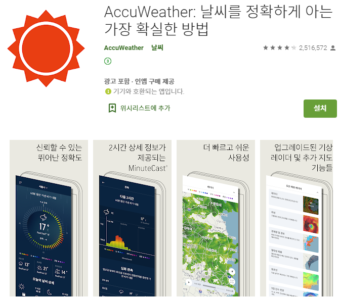 기상 정보가 분단위로 업데이트 되어 정확한 현지 예보를 제공하며 체감온도, 2주 앞선 예보, 맞춤 형 설정을 통해 차별화된 날씨 정보를 제공합니다.