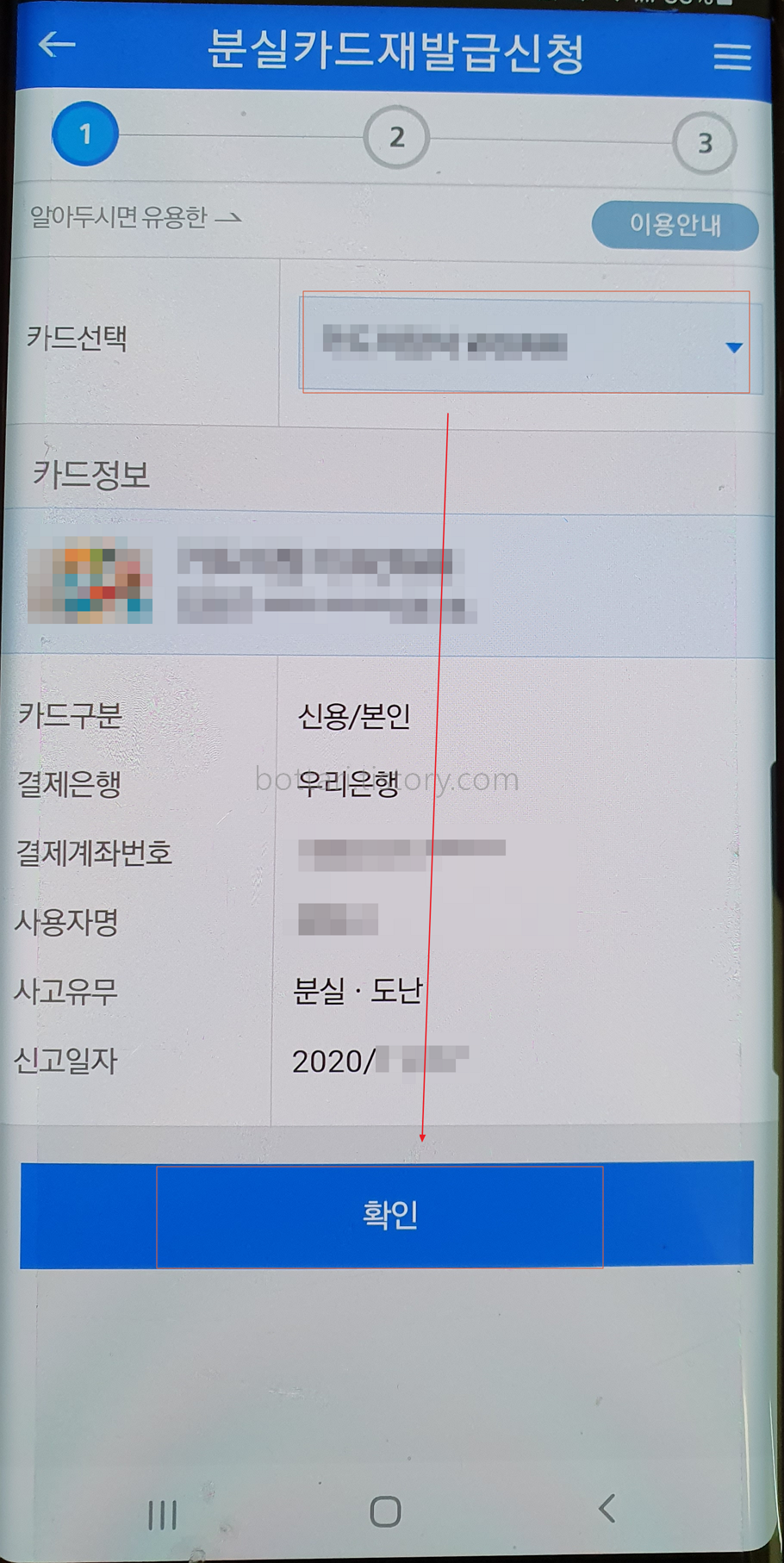 신청메뉴로 들어가면 보유하고 있는 카드를 확인할 수 있습니다. 여러장인경우 아래화살표를 클릭해서 신고할 카드를 선택합니다. 체크카드 역시 동일합니다. 카드정보를 확인한 뒤 확인을 클릭합니다.