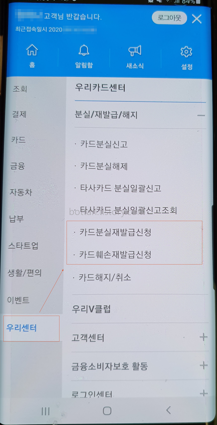 로그인 후 상단의 메뉴로 들어가서 왼쪽 우리센터를 클릭하면 카드분신고, 분실해제, 타사카드 분실일괄신고, 신고조회, 분실재발급신청, 카드훼손재발급신청, 카드해지/취소 등의 세부 메뉴를 볼 수 있습니다. 여기에서 분실신고만을 원하면 첫번째 카드분실신고를 재발급까지 한번에 신청하고자 할때에는 빨간색 박스안의 재발급 신청 메뉴를 클릭합니다.