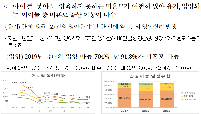 특히 최근 베이비박스 앞에서 신생아가 사망 한 사건, 중고거래앱에 아이를 입양 게시한 사건 등에따라 열악한 상황에 놓인 미혼모들의 환경이 조명되면서 미혼모 지원 제도의 개선 필요성이 높아졌습니다.