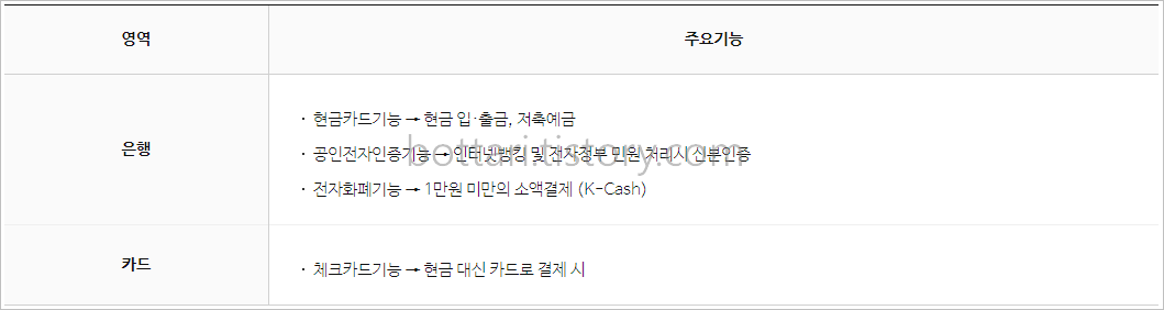 나라사랑카드의 기능은 크게 두가지입니다. 개인의 병역 및 전역정보를 저장하는 병역증, 전역증의 병무서비스와 체크카드나 현금카드, 전자통장, 공인인증서 기능의 금융서비스로 나눌 수 있습니다. (전자화폐 서비스는 2020년 12월 15일 자로 종료됩니다.) 현재 금융서비스는 국민은행과 IBK기업은행에서 제공하고 있습니다.