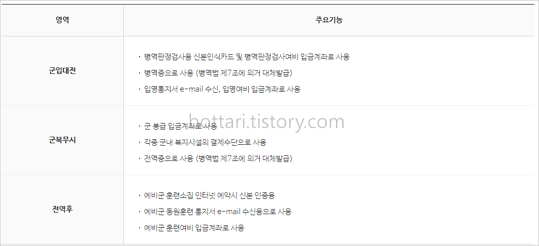 나라사랑카드는 병역증이나 전역증을 대체해서 사용할 수 있는 카드입니다. 병역판정 검사 시에 발급받을 수 있고 병역판정 검사 후부터 현역 또는 보충역 근무, 그리고 예비군 임무를 수행할때까지 나라에서 지급되는 급여를 받는 전자통장 기능도 하고 있습니다.