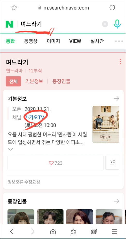 2. 스마트폰 모바일 웹사이트에서 며느라기 검색 후 카카오TV 시청