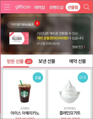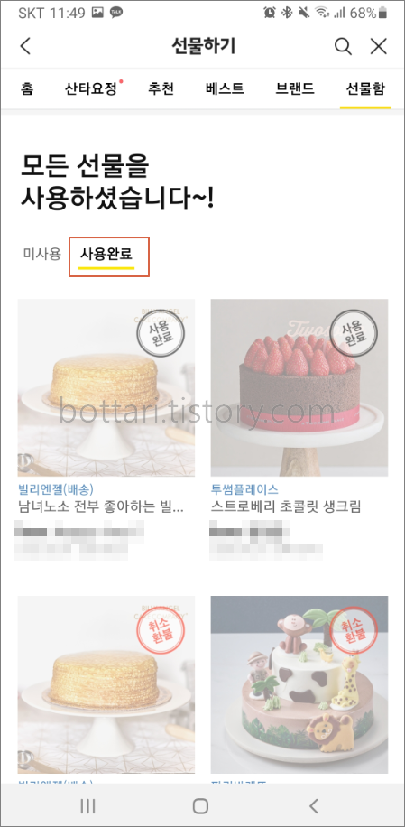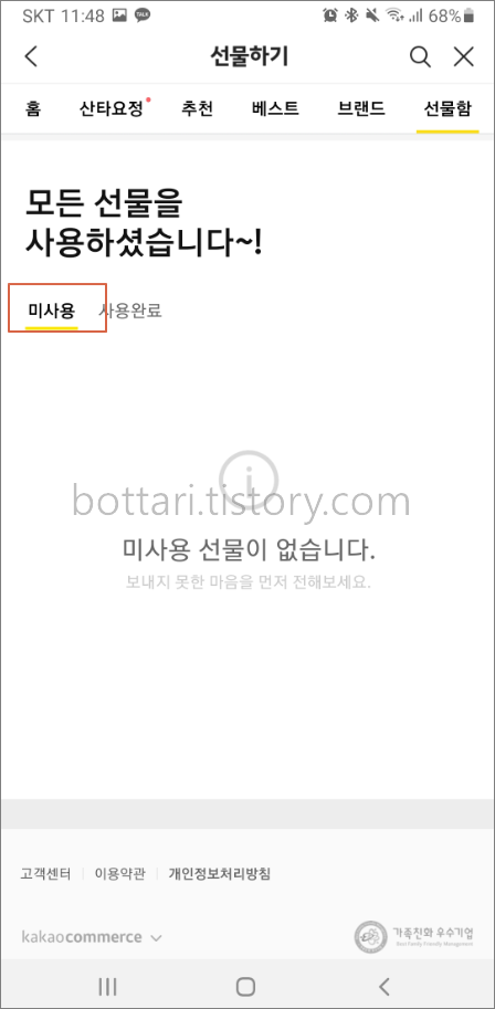 받은 선물함에서는 미사용 기프티콘과 사용완료된 것을 분류해 보여줍니다. 아직 사용하지 않은 기프티콘이 있다면 미사용 탭에서 확인할 수 있고 이미 사용된 것은 사용완료 탭에서 확인할 수 있습니다.