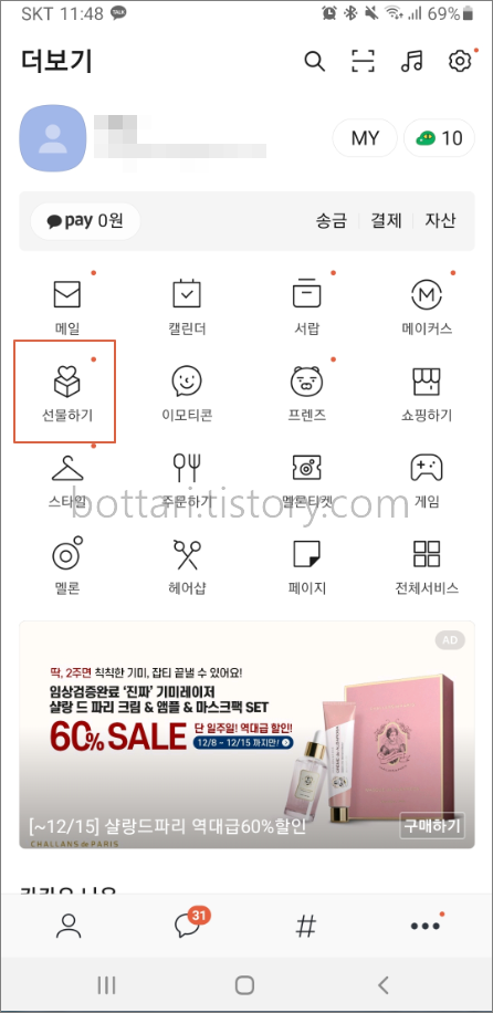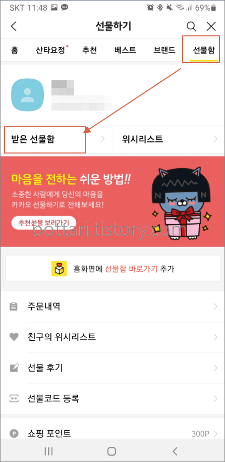 카카오톡 하단 가장 오른쪽 더보기 메뉴를 클릭한 뒤 선물하기로 들어갑니다. 다시 선물함을 클릭하면 받은선물함으로 들어갈 수 있습니다.