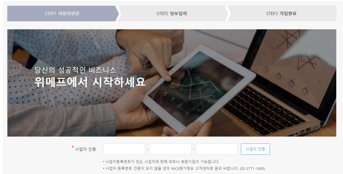 파트너 아이디가 없다면 먼저 회원가입합니다. 국세청에 사업자 신고가 되어 있는 개인 또는 법인 사업자만 회원가입이 가능합니다. 사업자등록번호를 입력하 고 사업자인증을 클릭하면 NICE평가정보 인증서비스를 통해 인증됩니다. 폐업한 등록번호이거나 이미 가입되어 있는 등록번호는 사용할 수 없습니다.