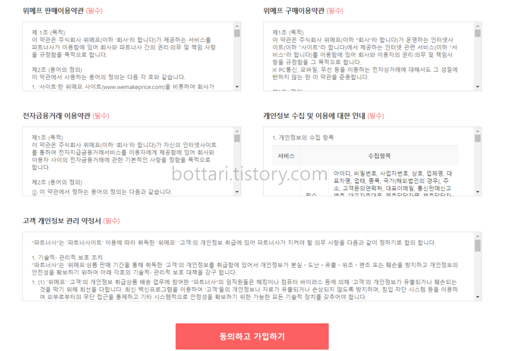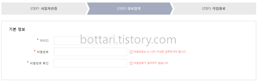 사업자인증 후 이용약관에 동의하고 가입 절차를 진행합니다.
