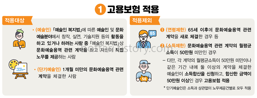 단, 65세 이후 새로운 용역관련 계약을 체결한 자 또는 생업 예술인과 취미활동을 하는 자들 구분하기 위하여 개별 문화예술 용역 관련 계약에 의한 합산소득이 월평균이 50만원 미만인 경우 대상에서 제외됩니다. 월 평균 소득이 50만원 이상이라면 고용보험 적용대상이므로 신청하시기 바랍니다.