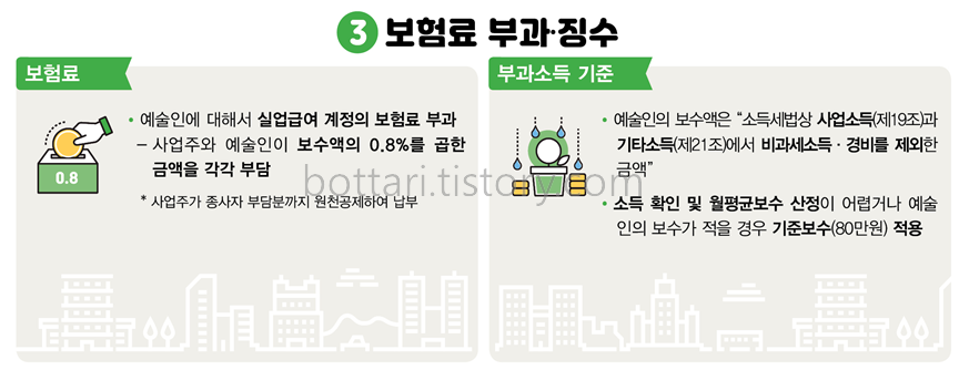 12월 10일부터 예술인의 고용보험이 적용됩니다. (제외 대상: 월 소득 50만원 미만의 예술인) 이는 지난 6월 공표되었던 '예술인 고용보험법'이 12월 10일 시행됨에 따라 가수, 배우, 그림작가 등 문화예술 용역 관련 계약을 체결한 문화예술인 중 예술인 복지법에 따라 예술활동을 증명받거나 신진예술인, 경력단절 예술인의 고용보험 적용내용입니다.