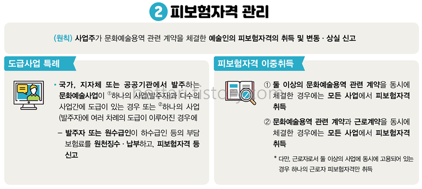 원칙적으로는 피보험자격의 취득 및 변동, 상실 내용에 대해 사업주가 신고해야하나 국가, 지차제 또는 공공기관에서 발주된 도급사업에 대해 발주자가 부담보험료를 원천징수, 납부하고 피보험자격을 신고해야합니다. 또한 둘 이상의 용역계약을 체결하거나 용역계약관 근로계약이 동시에 이루어진 경우 모든 사업에서 피보험자격을 취득하게 됩니다.