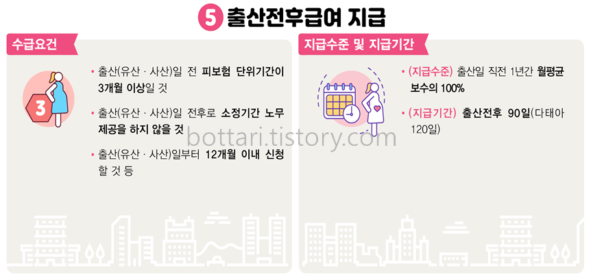 출산일 전 피보험가입기간이 3개월 이상, 출산일을 전후로 하여 일정 기간 근무하지 않은 경우, 출산일로부터 12개월 이내에 출산전후급여 지급을 신청할 수 있습니다. 지급액은 1년간의 월평균 보수액에 해당하고 단태아인 경우 90일 동안, 다태아의 경우 120일 동안 지급됩니다.