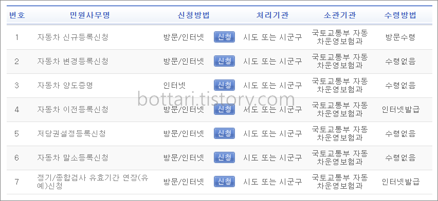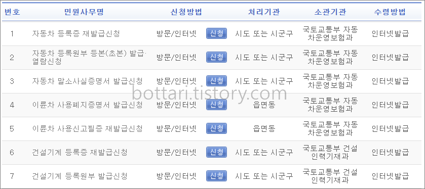 다음은 자동차대국민포털 사이트에서 인터넷신청이 가능한 등록 및 발급열람 민원목록입니다. 이용에 참고하시기 바랍니다.