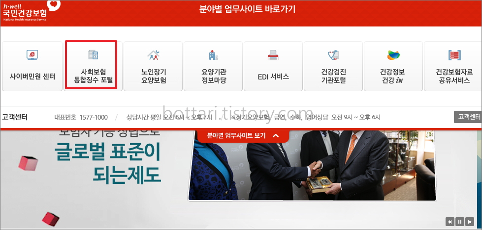 먼저 국 민 건 강 보 험 홈페이지에 들어가서 분야별 업무사이트보기 > 통합징수 포털을 클릭합니다. 또는 자주찾는 메뉴에서도 해당 메뉴를 확인할 수 있습니다.