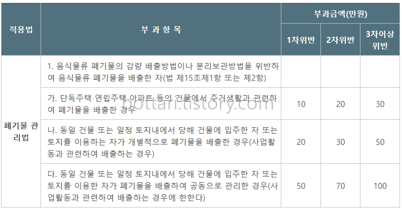 음식물쓰레기 또한 자원을 절약하고 환경을 보호하기위해 배출량에 따라 수수료를 부과하고 있습니다. 지역에 따라 종량기를 사용하거나 전용종량제봉투를 사용하게 되는데 다음과 같이 배출방법을 위반하거나 무단투기할 경우 최고 백만원이하의 과태료가 부과됩니다.