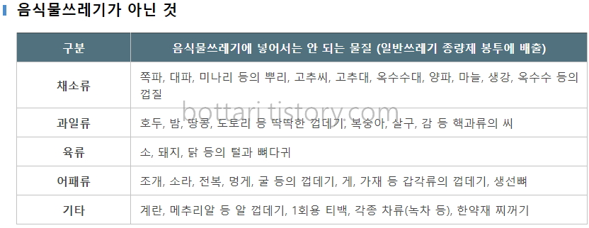음식물쓰레기로 배출가능한 항목은 간단히 사료로 사용될 수 있는 것이라고 생각하면 쉬운데 파뿌리나 고추씨, 옥수수껍질 등의 최소류나 딱딱한 껍데기나 씨류, 육류나 생선뼈, 어패류 껍데기, 계란껍질 등등은 일반쓰레기로 배출해야합니다.