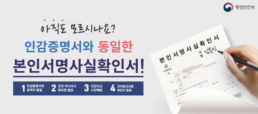 본인서명사실확인서는 인감증명서와 동일한 효력을 가지는 문서로 인감사전등록 및 주민센터 방문 발급이 필요한 인감증명서와 달리 인터넷으로도 간편하게 발급 가능한 장점이 있습니다.
