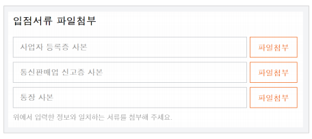 사업자등록증상의 정보를 입력합니다. 입점승인이 완료된 후에는 사업자번호 및 통신판매업신고번호는 수정할 수 없습니다.