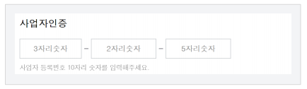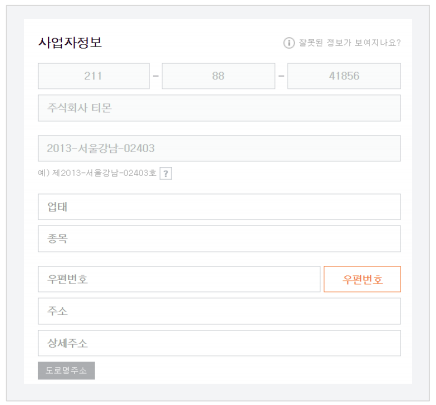 사업자번호 10자리 입력합니다. 휴업 또는 폐업상태인 경우 가입되지 않습니다. 통신판매업신고번호가 조회되지 않는경우 수동입점심사를 거쳐 진행되므로 1~2일 정도 소요될 수 있습니다.
