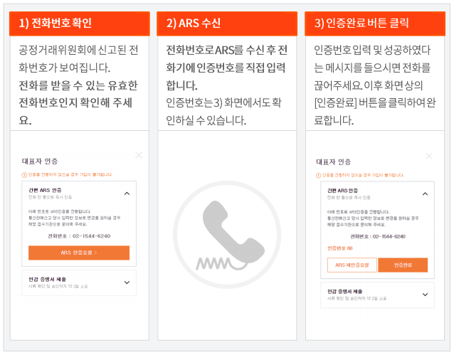 ARS 인증(공정거래위원회에 신고된 정보가 있을 경우) 또는 인감증명서 제출을 통해 대표자 인증합니다. 인감증명서 제출 시 수동심사가 진행됩니다.