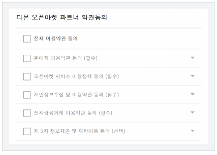 티몬 판매자센터 가입을 위해서는 사업자등록증사본, 통신판매업신고증사본, 대표자(법인명의)통장사본이 필요합니다. 간이과세자를 포함하는 개인사업자, 법인사업자, 비영리단체등이 사업자로 등록되어 있으며 통신판매업신고증을 받은 사업자는 누구나 입점할 수 있습니다.