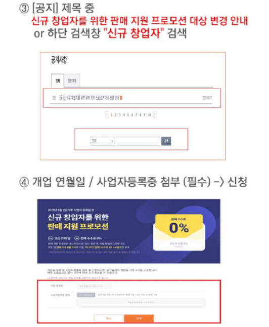 티몬 신규창업자를 위한 판매프로모션이 진행중입니다. 2019년 8월 1일 이후 신규창업자는 익월 말일까지 판매수수료를 0% 적용, 카드결제 수수료는 3% vat 별도만 부과합니다. 신청방법은 그림을 참고하세요.