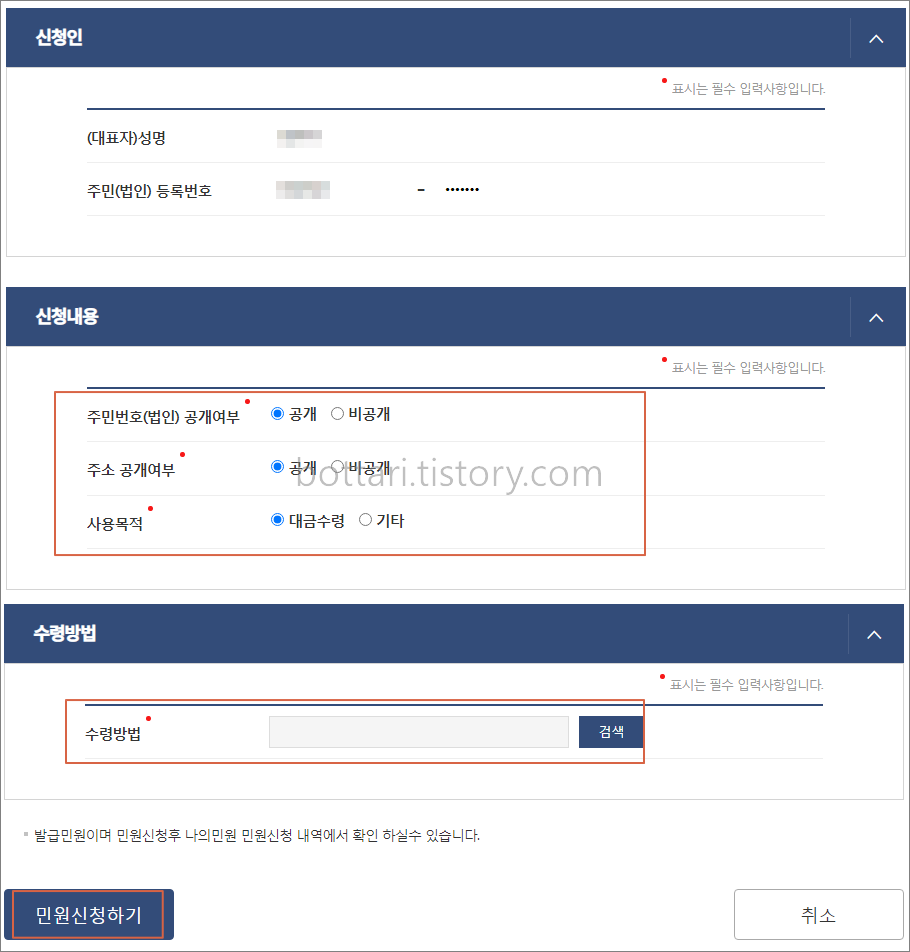 신청서 양식은 매우 간단합니다. 신청인 정보를 확인한 뒤 신청내용에 체크합니다. 수령방법은 본인출력 또는 전자문서지갑을 선택합니다. 온라인열람 메뉴는 법적 효력이 없으므로 기관 제출시에는 온라인발급 중 선택합니다. PDF파일 저장이나 프린터 출력을 위해서는 본인출력을 선택한 뒤 PC에서 이용가능합니다. 마지막으로 신청하기를 클릭합니다.