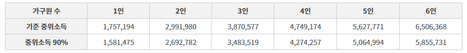 - 기준중위소득 75% 이하 (1인가구 기준 1,317,896원 이하, 4인가구기준 3,561,881원 이하)