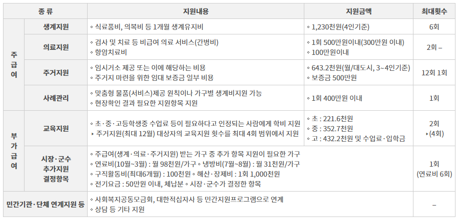 생계비지원, 의료비 지원, 주거비지원 등이 주요내용입니다. 또한 초중고등학생 교육비 및 연료비, 구직활동비, 전기요금등 부가급여를 추가지원받을 수 있습니다.