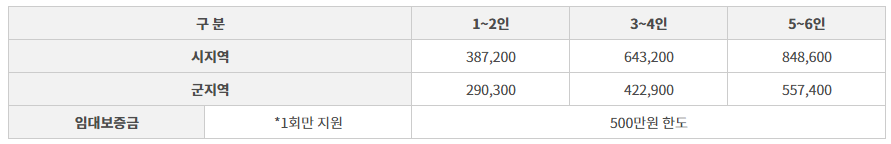 - 재산기준 : 시지역 25,700만원 이하, 군지역 16,000만원 이하