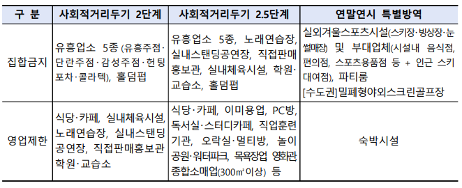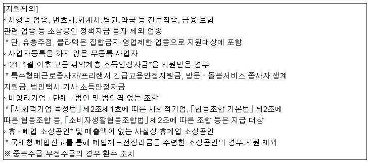 - 영업제한업종, 집합금지업종 : 수도권 거리두기 2.5단계, 비수도권 거리두기 2단계, 연말연시 특별방역 및 지자체별 별도 방역조치를 포함해 11월 24일 이후 해당 영업 제한 및 집합 금지에 해당하는 소상공인