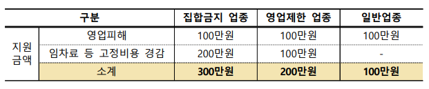 지원금액은 일반업종에 대해 100만원, 영업제한업종 200만원, 집합금지업종 300만원입니다.
