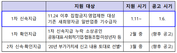 1차 확인지급(2월 예정)은 1월 중 공고되며 2차신속지급 및 확인지급은 3월에 공고 및 지급예정되어 있습니다.