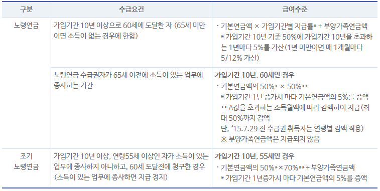 일반적으로 만62세부터 수령하게 되지만 소득이 없다면 만55세부터 조기수령을 신청할수 있습니다. 이를 조기노령연금이라고 하며 신청에 따라 60세 전이라도 지급받을 수 있습니다. 다만 조기신청해 지급받다가 60세 이전에 소득이 있는 업무에 종사하게 되면 그 소득이 있는 기간동안에는 연금지급이 정지됩니다.