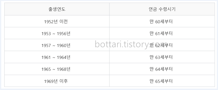 기본적으로는 만 65세부터 받을 수 있으나 노령사회로 접어들면서 출생연도에 따라 연금수령시기가 다르게 적용되고 있습니다.