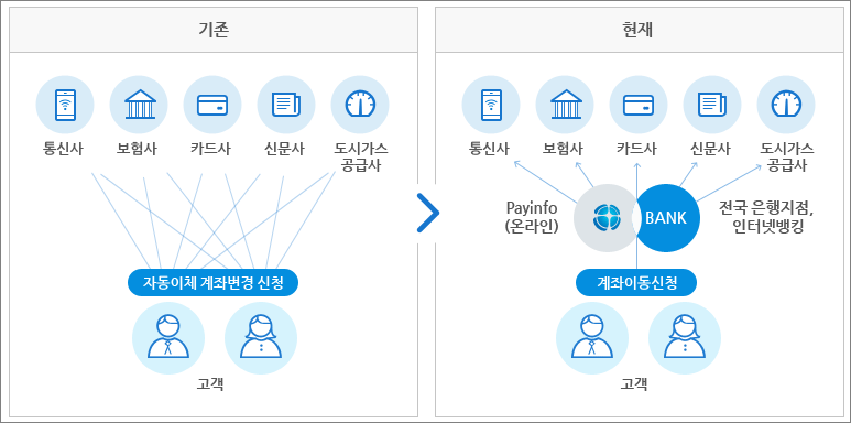 여러 금융회사에 등록되어 있는 자동이체등록정보를 일괄 조회하고 해지 또는 변경할 수 있습니다. 이는 거래계좌 변경 시 요금청구기관등의 자동이체를 하나씩 해지하고 신규등록해야하는 불편함을 해소하고 요금청구기관이 부당등록하거나 계약이 종료된 자동이체를 삭제하지 않은 경우까지 모두 확인할 수 있어 금융사고의 위험을 낮출 수 있습니다.