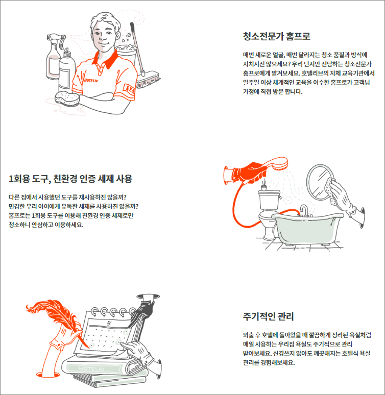 화장실 청소 업체 이용을 고민할 때 가장 걱정이 되었던 부분이 정기적으로 와서 청소를 하면 처음한번만 꼼꼼히 하고 그 후엔 눈에 보이는 곳만 닦고 정리하는 것이 아닐까 하는 부분이었습니다. 한편 호텔리브 홈페이지를 둘러보면서 담당홈프로가 지정되어있고 청소메뉴얼 등 관리가 잘 되는 것 같아 이런 부분은 믿고 맡길 수 있겠다 생각이 되었습니다.