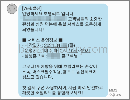 그러던 중 한참 전에 등록해두었던 호텔리브 알림서비스로부터 우리아파트 욕실서비스가 오픈되었다는 메세지를 받았습니다. 출산 후에 화장실청소쉽게하는방법부터 검색하고 검색해 화장실청소업체까지 알아보게 되었습니다. 하지만 대부분 입주청소처럼 일회성으로 가격도 비싸서 이용하지 못했는데 주기적으로 방문해 화장실만 전문적으로 관리해주는 업체에 대해 대해 알게되었습니다.