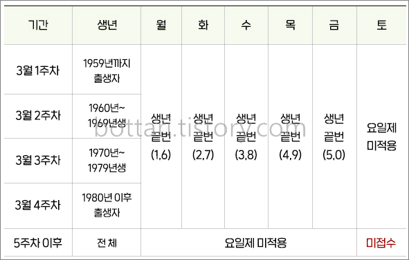 방문접수 역시 출생연도에 따라 신청기간이 달라집니다. 온라인 신청과 달리 3월 첫째주는 1959년 이전, 둘째주는 1960년~1969년, 셋째주는 1970~1979년, 넷째주는 1980년 이후 출생자가 신청 대상입니다. 여기에 출생연도 요일별 5부제가 적용됩니다. 토요일에는 출생연도와 상관없이 신청할 수 있습니다.