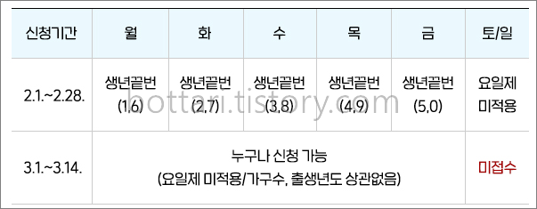 2월 1일부터 2월 28일까지는 출생연도 5부제가 적용되어 출생년도 끝자리가 1,6인 경우 월요일, 2,7은 화요일, 3,8은 수요일, 4,9는 목요일, 5,0은 금요일에 각각 신청할 수 있습니다. 토요일, 일요일 그리고 3월에는 5부제가 적용되지 않습니다.