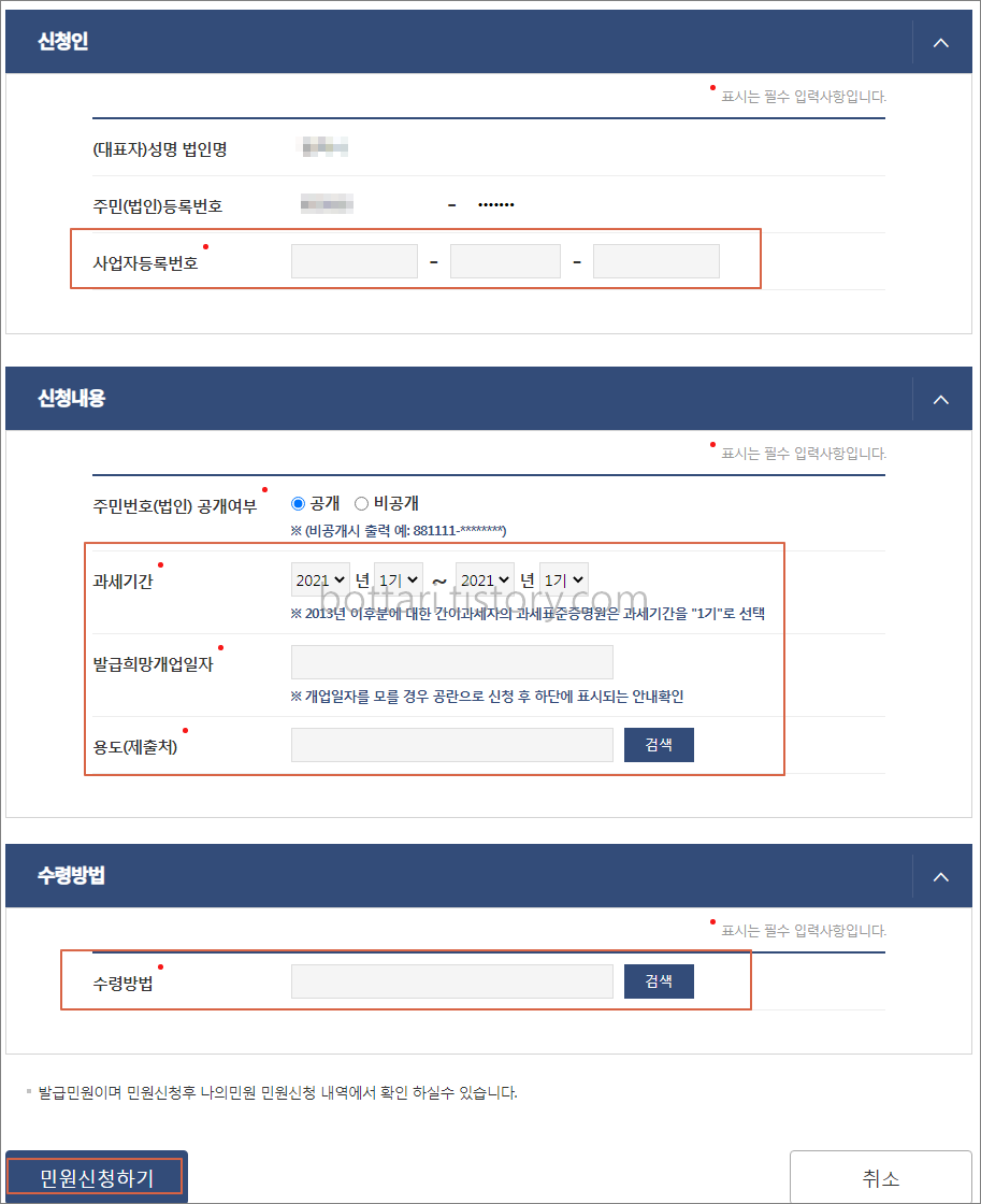 사업자등록번호 입력 후 과세기간을 선택합니다. 발급희망개업일자는 모를 경우 비워두고 나머지 항목을 모두 채운 뒤 신청하기를 클릭하면 개업일자를 확인할 수 있습니다. 안내되는 개업일자를 기입하면 됩니다.