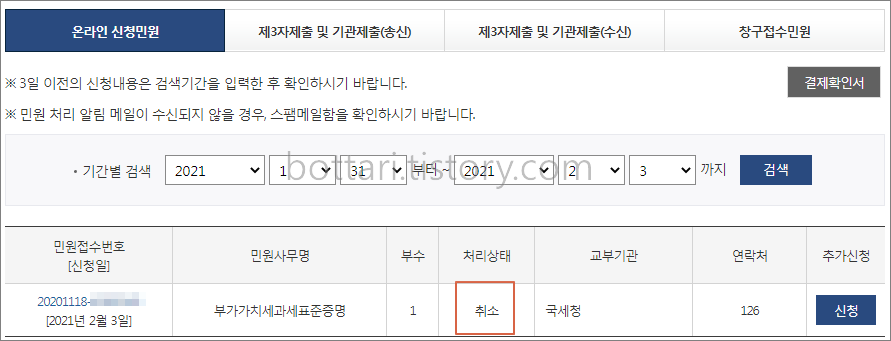 민원처리결과에서 접수한 내용을 확인할 수 있습니다. 부가가치세과세표준증명서 신청 가능시간은 오전8시부터 오후10시까지입니다. 방금 접수한 건은 이용시간이 아닌 사유로 처리상태가 취소로 표시되고 있습니다.