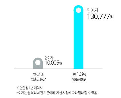 1.3% 이자는 전월실적이나 급여이체, 자동이체 등 우대조건없이 모두 동일하게 적용되는 조건이며 입금한도의 제한도 없어 자유롭게 이용가능합니다.