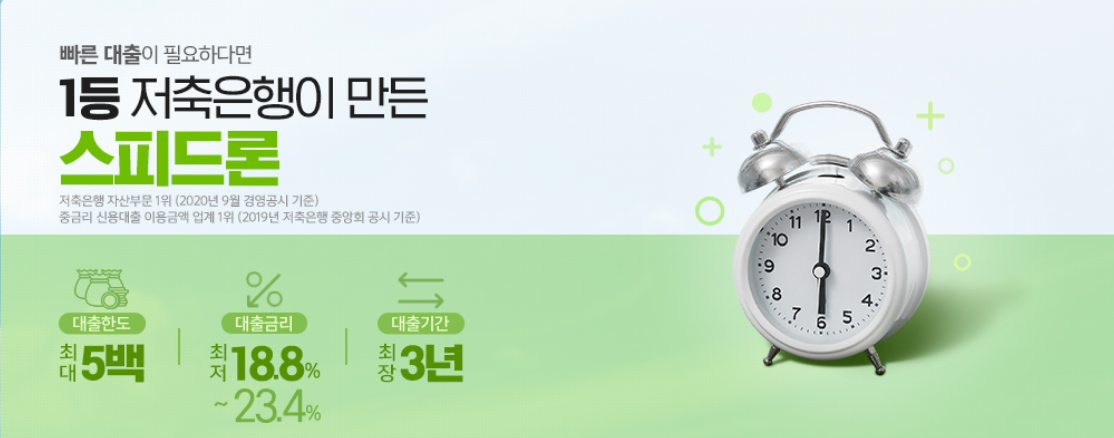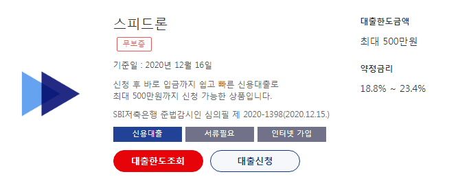 SBI저축은행 스피드론은 긴급하게 소액이 필요할 때 적합한 상품입니다. 소액상품들 중에서 비교적 한도가 높고 신청 후빠른 시간안에 입금되기 때문에 긴급 자금 융통 시 유용합니다. 정확한 한도 및 금리는 SBI저축은행 홈페이지에서 간단히 조회할 수 있습니다. 한도조회는 신용도에는 영향을 미치지 않습니다. 자세한 내용을 확인하시기 바랍니다.
