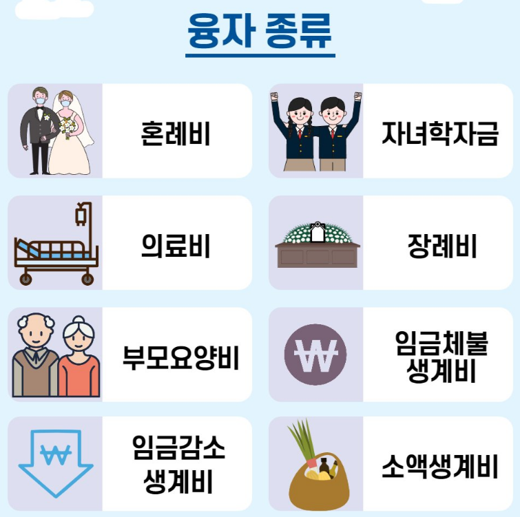 근로복지공단은 근로자의 생활안정을 위해여 의료비, 장례비, 자녀학자금, 혼례비, 임금체불생계비 등 생활에 필요한 기초자금들을 낮은 금리로 빌려주고 있습니다. 연1.5%의 낮은 이자율로 1인당 최대 2천만원까지 지원받을 수 있으며 자금의 유형에 따라 최대한도액이 달라집니다. 자세한 내용을 확인하시기 바랍니다.