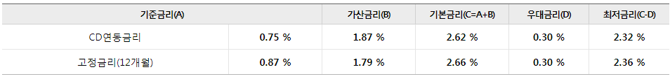- 신청조건에 따라 달라질 수 있으며 내부신용등급 1등급, 만기일시상환 시 최저금리는 연 2.32~2.36% 입니다.
