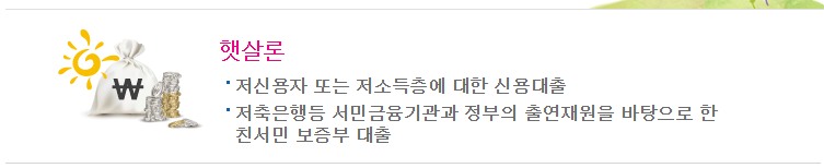 소득이 낮거나 신용등급이 낮아 일반 금융기관으로부터 대출을 받기 어려웠던 분들께 햇살론은 유용한 대안이 될 수 있습니다. 햇살론은 서민금융기관과 정부의 출연재원을 바탕으로 한 서민을 위한 보증부 대출상품입니다. 1금융권에서는 승인이 나지않아 금리가 높은 상품들을 이용할 수 밖에 없었던 분들이라면 저금리에서 중금리로 햇살론을 이용할 수 있어 이자의 부담을 줄일 수 있습니다.