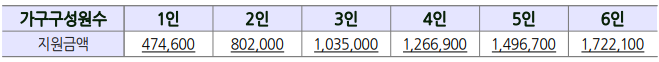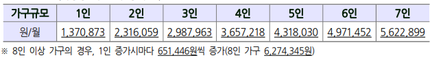 □ 가구수에 따라 매월 지급되는 금액은 4인가구일때 1,266,900원으로 지난해 (1,230,000원)보다 36,900원 증가하였습니다. 가구구성원이 7인 이상인 경우 1인 증가시마다 225,400원씩 추가됩니다.